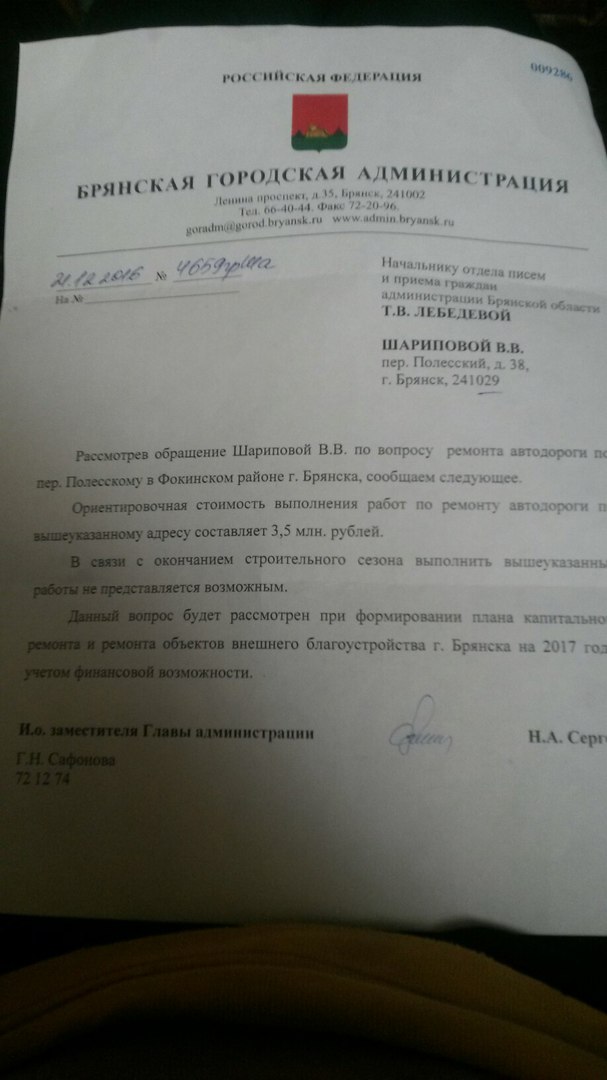 Я тоже писал несколько обращений, только по поводу 1-го проезда Станке-Димитрова, где три детских садика и школа. Отвечают, что рассмотрят этот вопрос, при наличии финансовой возможности. Я тогда тоже буду рассматривать вопрос об уплате ТРАНСПОРТНОГО НАЛОГА только при наличии у меня финансовой возможности. Если что покажу налоговикам свои обращения и ответы на них. ГОСТ 50597: "Предельные размеры отдельных просадок, выбоин не должны превышать по длине 15 см, ширине - 60 см и глубине - 5 см".