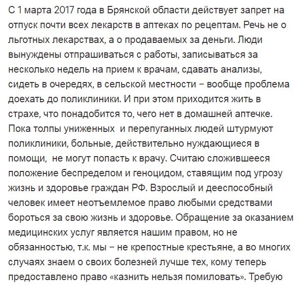 Жительница Брянска на "Change.org" написала петицию в министерство здравоохранения с требованием незамедлительно обеспечить людям свободный доступ к лекарственным средствам.