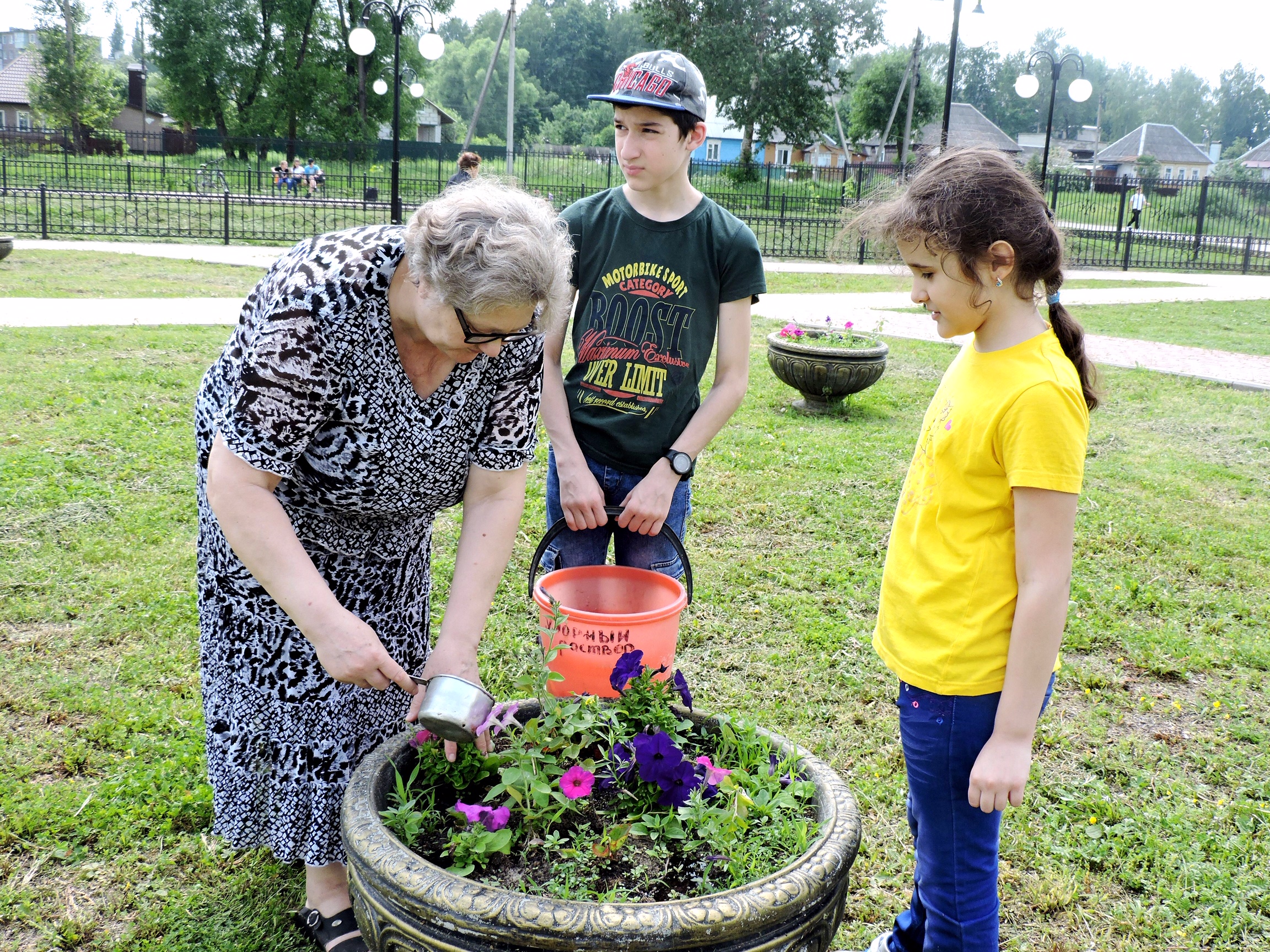 В металлическом двухъярусном сооружении благоухают белые петунии и нежные орхидеи. Добровольцы-активисты стараются проявлять инициативу и ухаживают за цветочными клумбами, высаживают зелёные насаждения, кустарники.