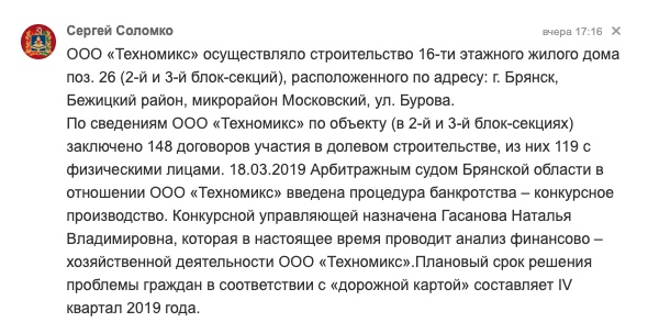 Люди вынуждены жить на съёмном жилье и выплачивать ипотеку за недостроенные квартиры. Недавно дольщики записали видеобращение к Владимиру Путину с просьбой помочь. Вчера, 10 июня, редакцию «БрянскToday» поступил ответ от первого замдиректора регионального департамента строительства Сергея Соломко.
