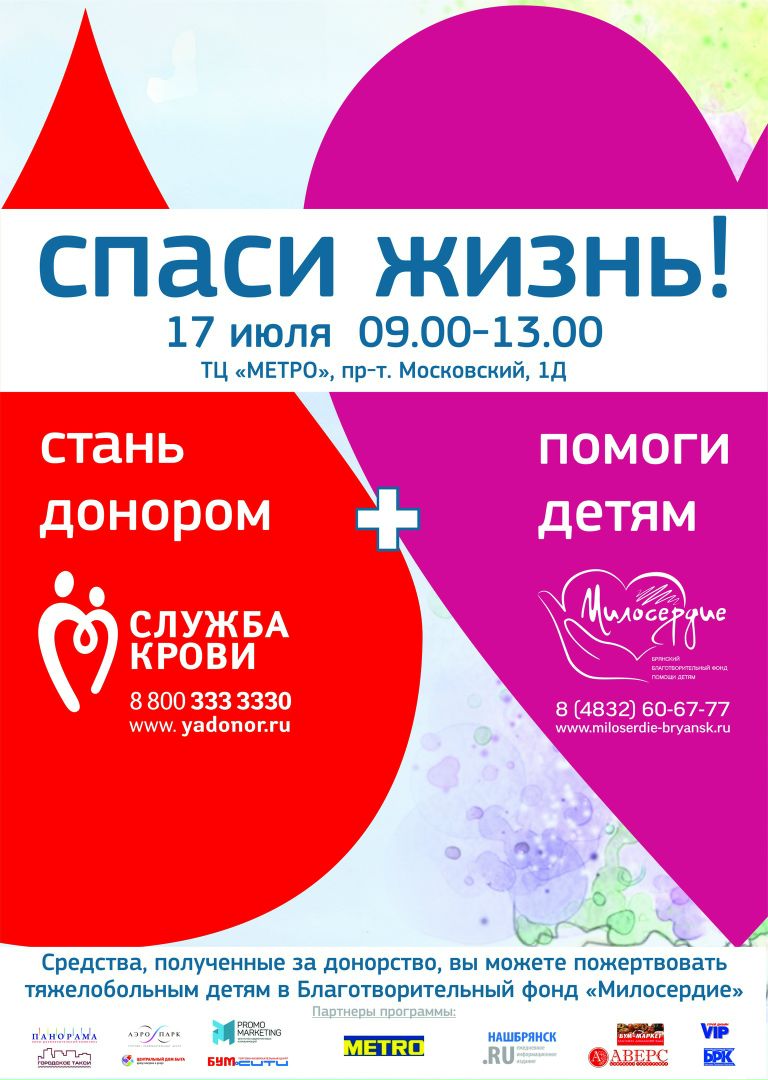В среду, 17 июля, возле гипермаркет «Метро» в Фокинском районе Брянска пройдёт акция «Стань донором». Её совместно с областной станцией переливания крови проводит благотворительный фонд «Милосердия».
