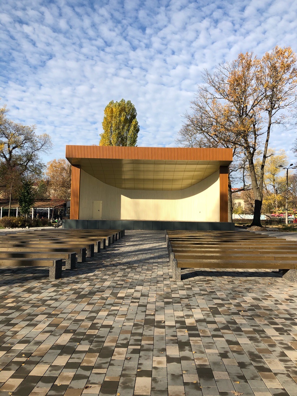 Скамейки надо было ставить парковые со спинками(на этих пожилым людям сидеть неудобно, надо было оставить уклон перед летней эстрадой для удобства зрителям, возможно надо было посадить вдоль дорожек декоративные красиво подстриженные кустарники.