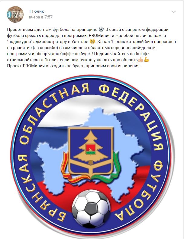В брянском областном футболе произошел небольшой скандал из-за видео на YouTube. Местный болельщик и автор видеоблога о футболе «1Голик» (в сети его псевдоним Евгений Голиков) сообщил, что областная федерация футбола написала жалобу в видеосервис. Функционерам не понравилось, что на проекте о мини-футболе PROМинич было использовано видео, права на которое принадлежат федерации. В итоге ролик заблокировали за нарушение.