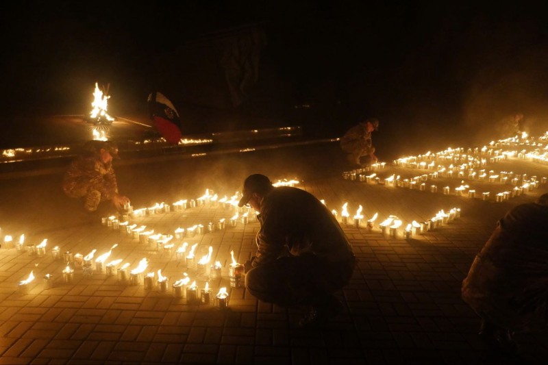 Бойцы склонили головы в минуте молчания, вспоминая подвиг тех, кто ценой собственной жизни приблизил долгожданную Победу. Зажженные свечи стали символом вечной памяти о павших.