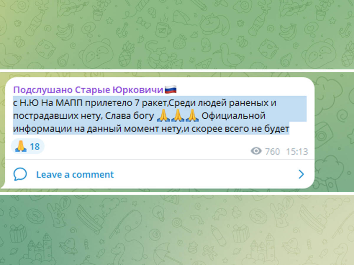 Ранее в чате сообщалось об атаке автомобильного пункта пропуска «Новые Юрковичи» в Климовском районе восемью ракетами. Автор ссылался на жителей одноименного поселка.