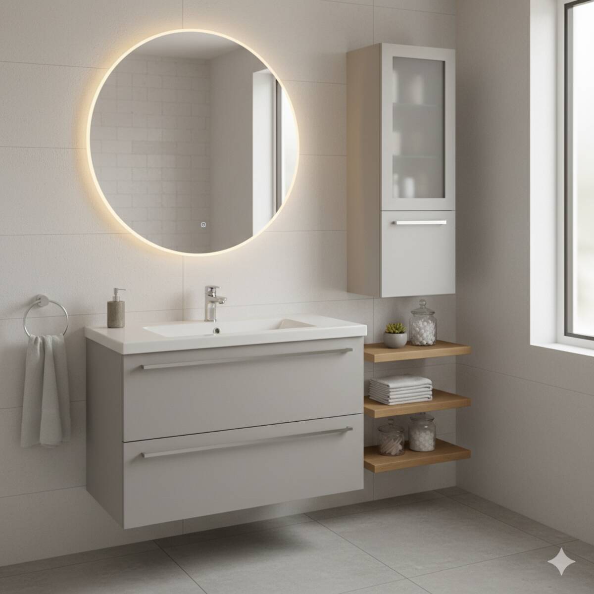 Для больших ванных комнат (от 8 м²) — это отличное решение. Модульные системы позволяют создать индивидуальный «интерьерный блок»: комбинируете тумбу, зеркало, открытые полки, ящики для белья, даже мини-бар или место для фена.