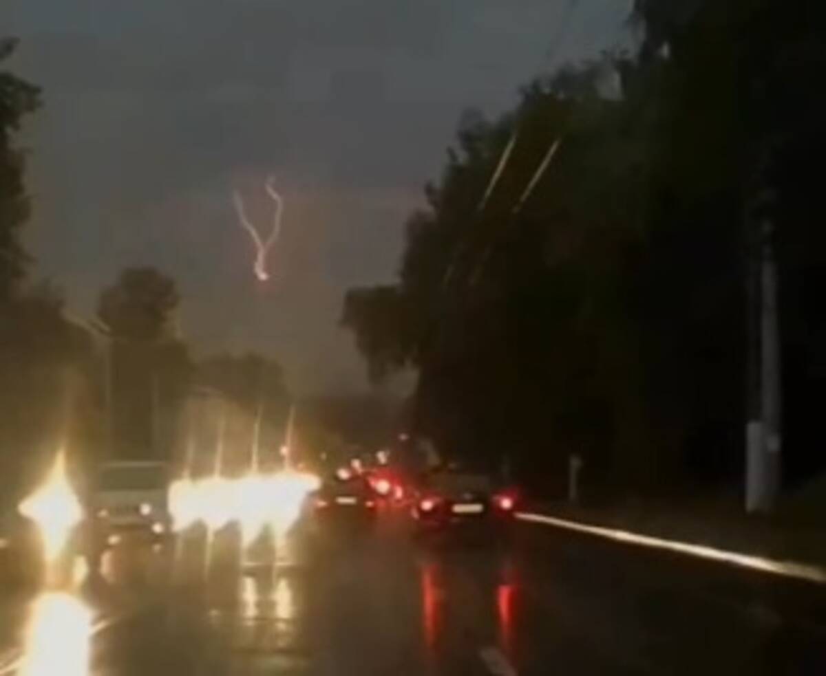 На Брянск вечером 11 июля обрушилась гроза и сильный ветер. Над городом сверкает молния и идет дождь.