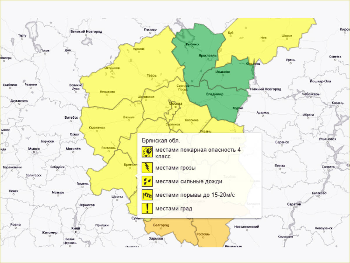 Так, до 9 часов вечера 17 июля на Брянщине прогнозируют порывистый ветер и град (местами). Затем вступит в силу предупреждение о сильных дождях: активно до 9 часов утра 18 июля. Завтра, 18-го, в течение дня ожидают порывы ветра до 15-20 метров в секунду. Местами возможны грозы и град. Еще одна «напасть» - четвертый класс пожарной опасности. Период этого предупреждения: до 9 часов утра 19 июля. Населению следует проявить осторожность.