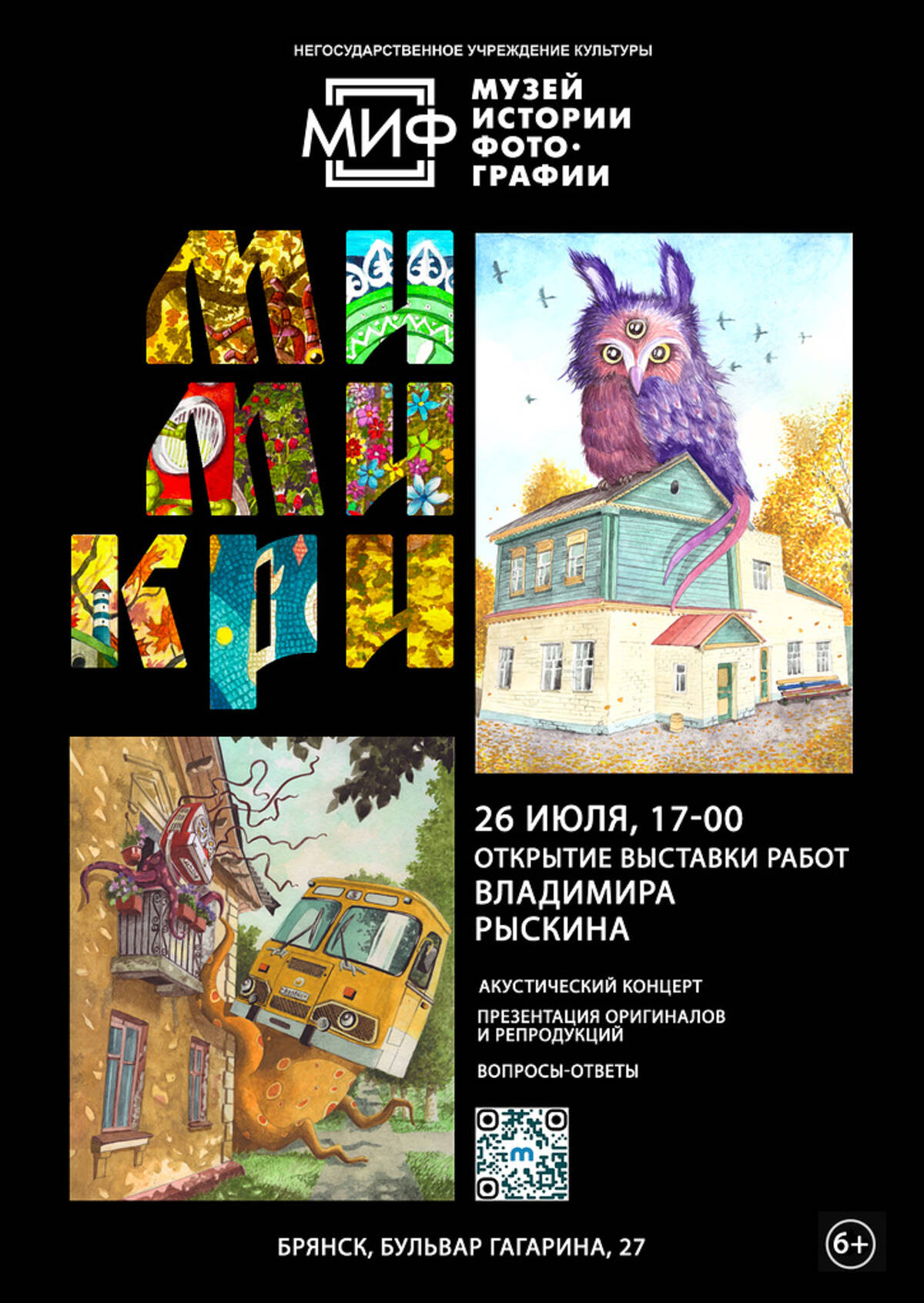26 июля в 17:00 в Брянском музее истории фотографии «МИФ» состоится открытие персональной выставки акварелей "МиМиКри" Владимира Рыскина, автора песен, стихов и комиксов.