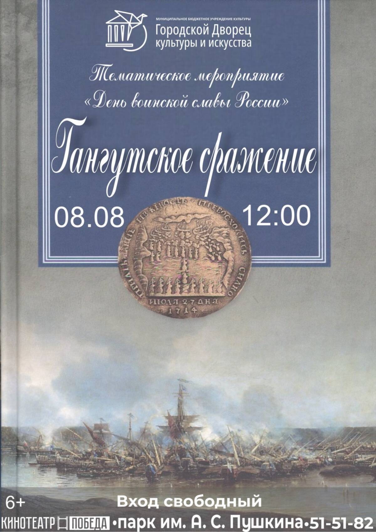 Брянский городской Дворец культуры и искусства приглашает жителей и гостей города на тематическое мероприятие, приуроченное ко Дню воинской славы России. Торжество посвящено важной исторической дате – победе русского флота у мыса Гангут. Мероприятие состоится 8 августа в 12:00 в живописном парке имени А.С. Пушкина. Но в случае неблагоприятных погодных условий мероприятие будет перенесено в фойе Городского Дворца культуры и искусства..