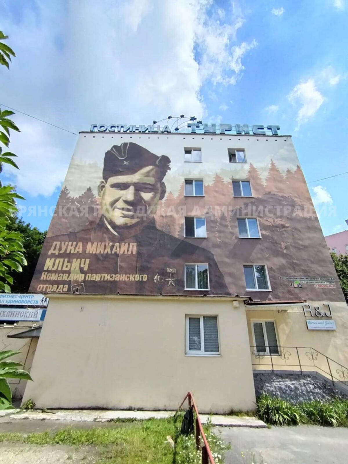 В Брянске завершились работы по восстановлению масштабного мурала, изображающего Героя Советского Союза Михаила Ильича Дуку, видного командира и одного из лидеров партизанского движения на Брянщине в годы Великой Отечественной войны. Портрет расположен на фасаде гостиницы «Турист».