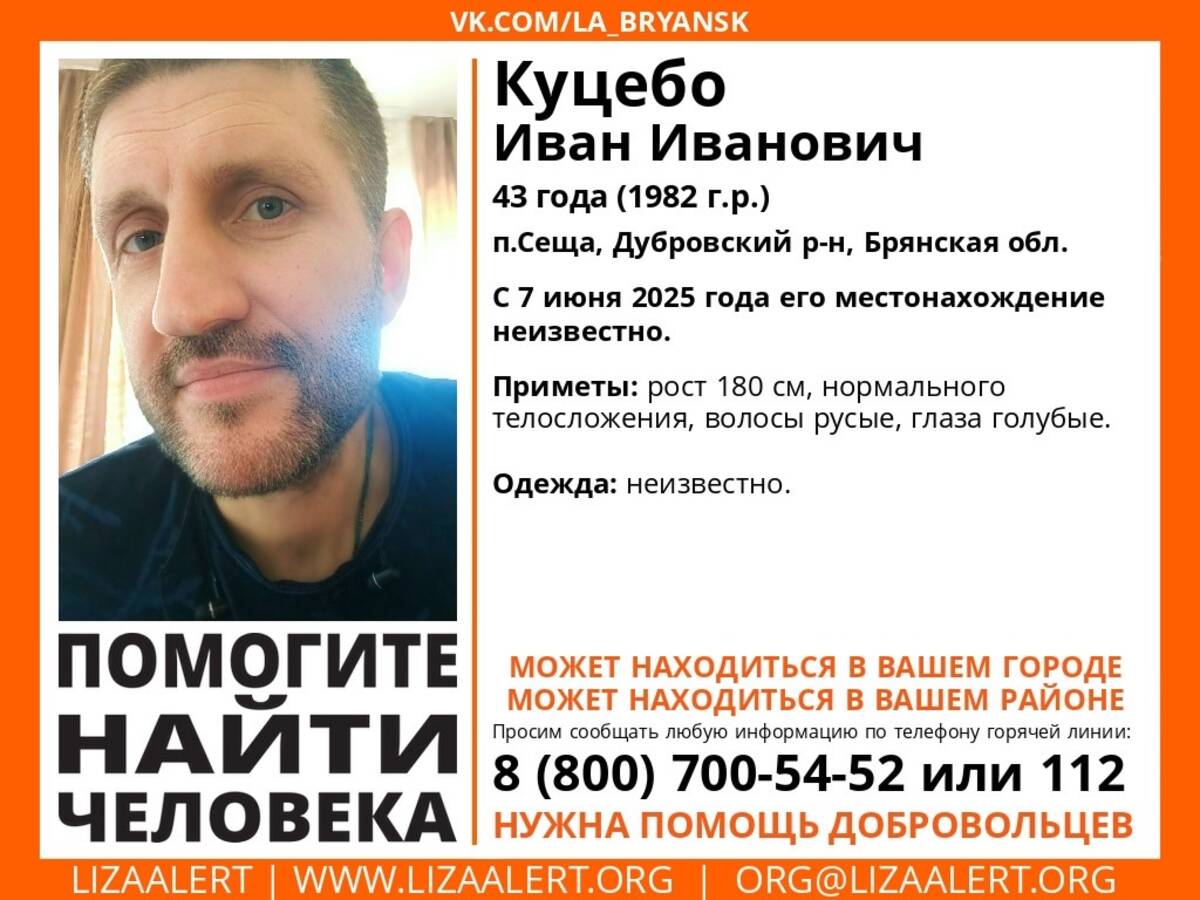 В Брянской области без вести пропал 43-летний Иван Куцебо. Об этом сообщили в поисково-спасательном отряде «ЛизаАлерт».