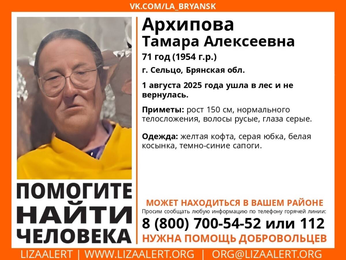 В Сельцо Брянской области без вести пропала 71-летняя Тамара Архипова. Об этом рассказали в поисково-спасательном отряде ЛизаАлерт.