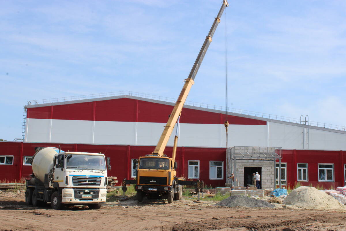 Строители производят облицовку плиткой стен и полов в помещениях, обработку огнезащитой металлоконструкций в спортивном зале, отделку помещений водоподготовки в подвале. Кроме того, осуществляется устройство канализации (тянут под подвалом), залиты крыльца, завезен материал для устройства вентиляции. На объекте работает 26 человек.