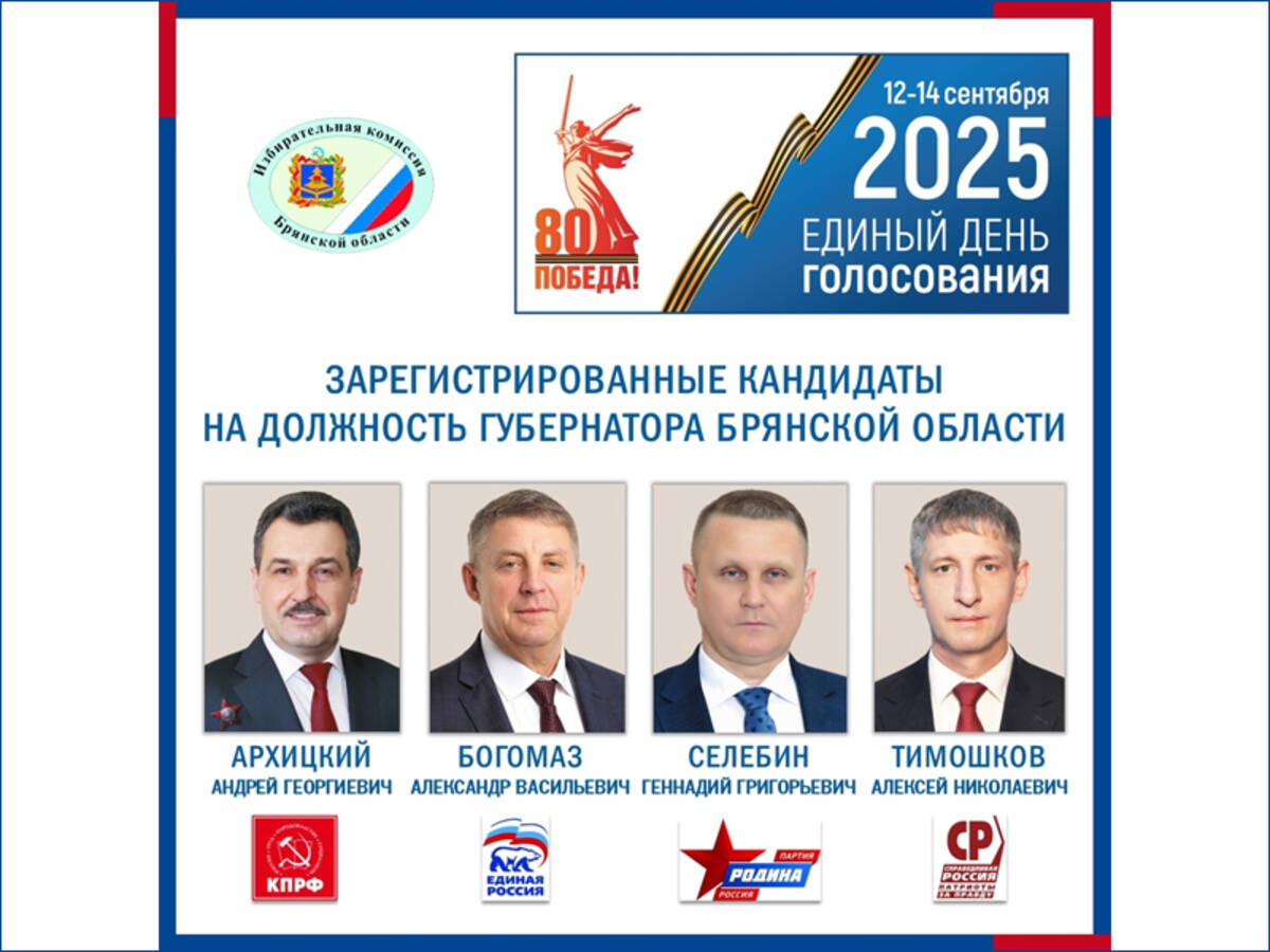На пост главы региона претендуют четверо. Это действующий губернатор Александр Богомаз («Единая Россия»), Андрей Архицкий («КПРФ»), Геннадий Селебин («Родина») и Алексей Тимошков («Справедливая Россия - Патриоты - За правду!»). Кандидаты собрали необходимое количество подписей и в срок зарегистрировались. Выборы состоятся 12-14 сентября.