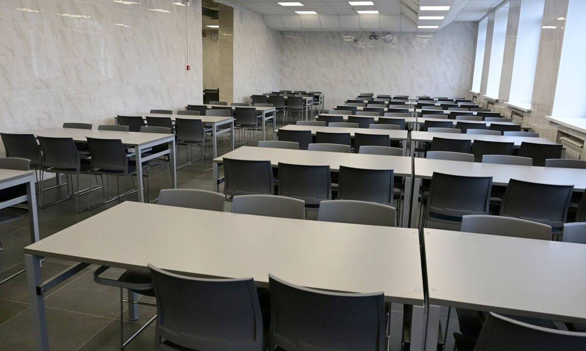 В современной пристройке разместились многофункциональные зоны для внеурочной деятельности, специализированный физический класс, спортивный комплекс, современный пищеблок, актовый и читальный залы, а также пространство для школьного музея.
