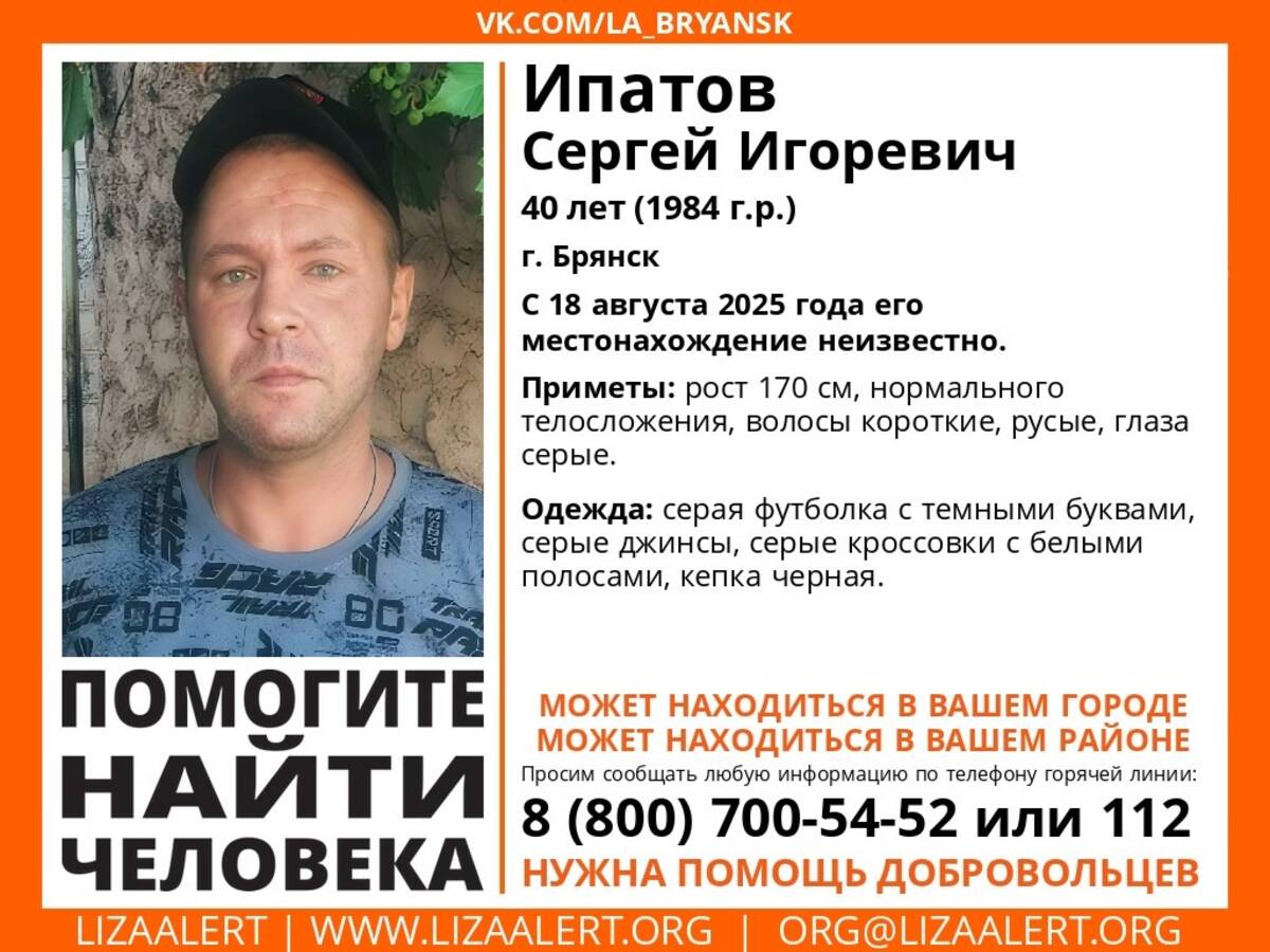 В Брянске ищут пропавшего 40-летнего Сергея Ипатова. Об этом сообщили в поисково-спасательном отряде «ЛизаАлерт».