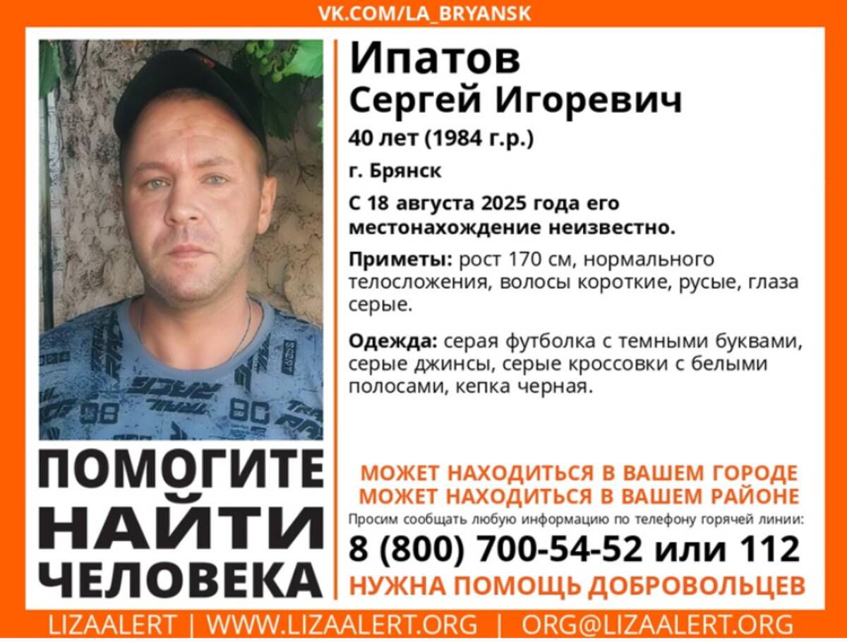 В Брянске разыскивают 40-летнего Сергея Ипатова, о местонахождении которого ничего не известно с 18 августа.