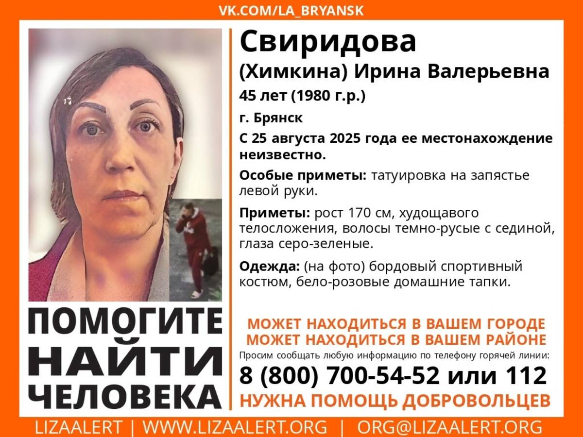 В Брянске без вести пропала 45-летняя Ирина Свиридова. С 25 августа о ее местонахождении ничего не известно.