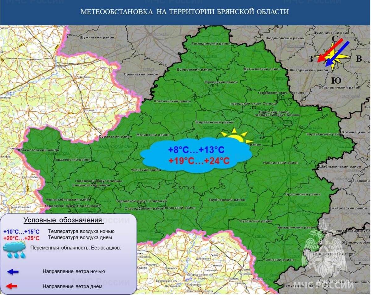 10 сентября на территории Брянской области ожидается переменная облачность, без осадков. Северо-восточный ветер будет дуть со скоростью 8-13 м/с. Воздух прогреется до +19ºC…+24ºC.