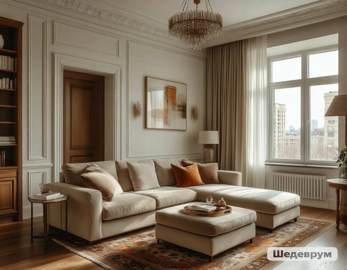 Качество имеет значение. Натуральное дерево, камень, экологичные ткани не только красиво выглядят, но и создают ощущение долговечности. Детали завершают картину: картины, текстиль, светильники, фотографии и книги делают квартиру живой.