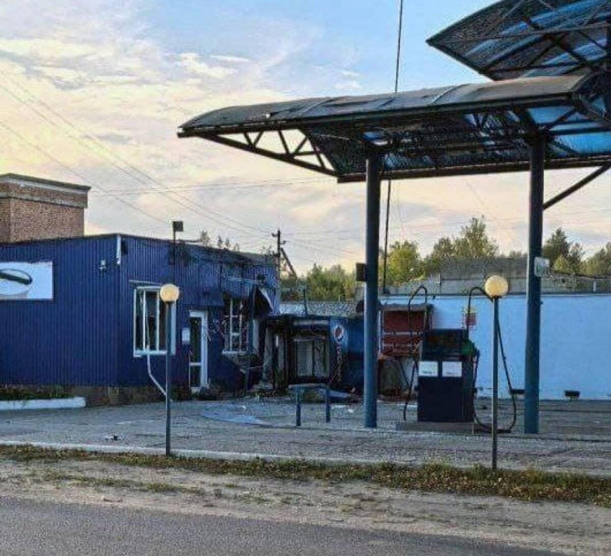 Как рассказали в соцсетях местные жители, один из украинских дронов упал на АЗС при въезде в Климово. На снимке видны разрушения основного помещения.
