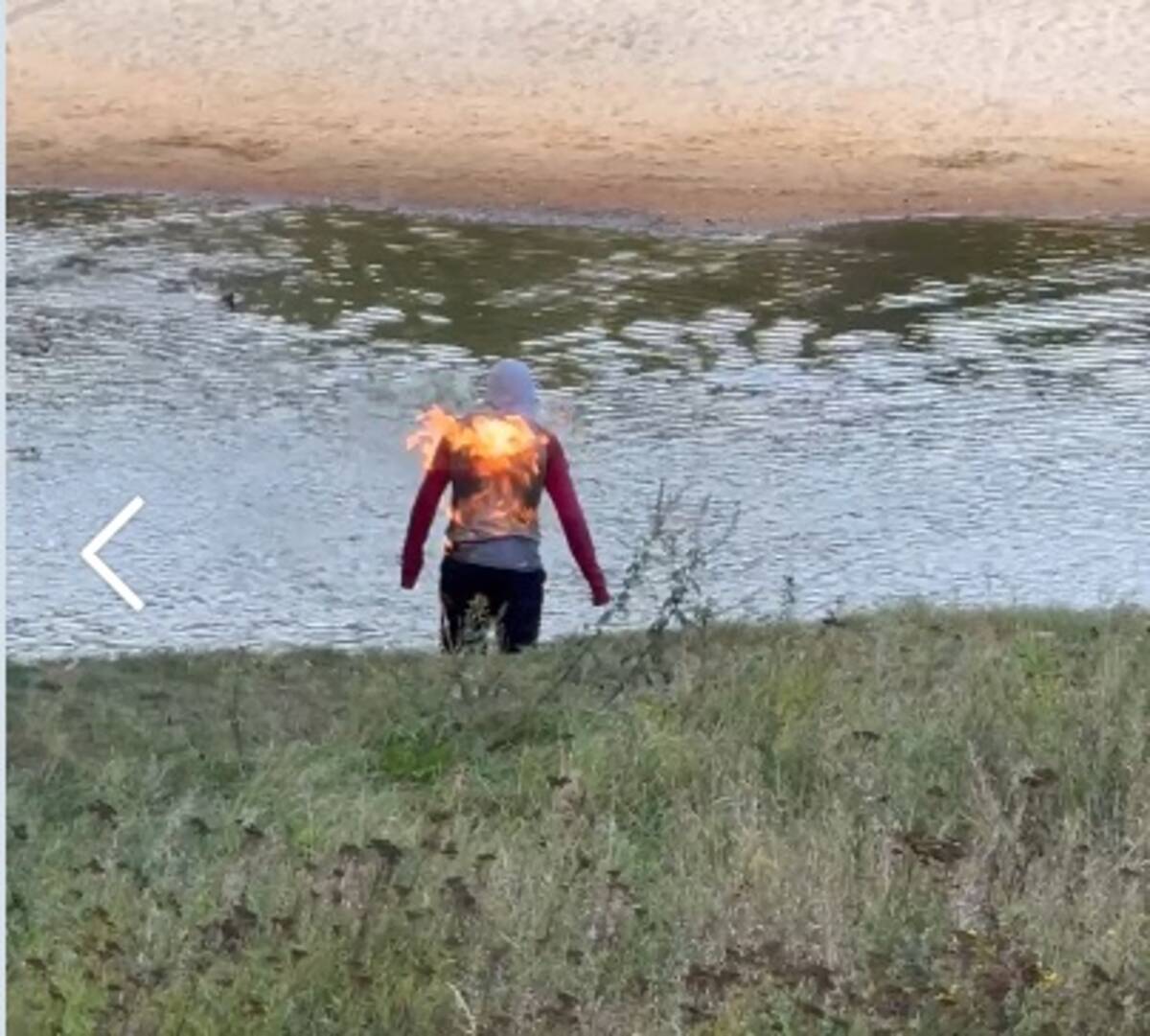 На записи видно, как у воды ходит парень, на котором полыхает кофта. Рядом находятся еще два парня и девушка.