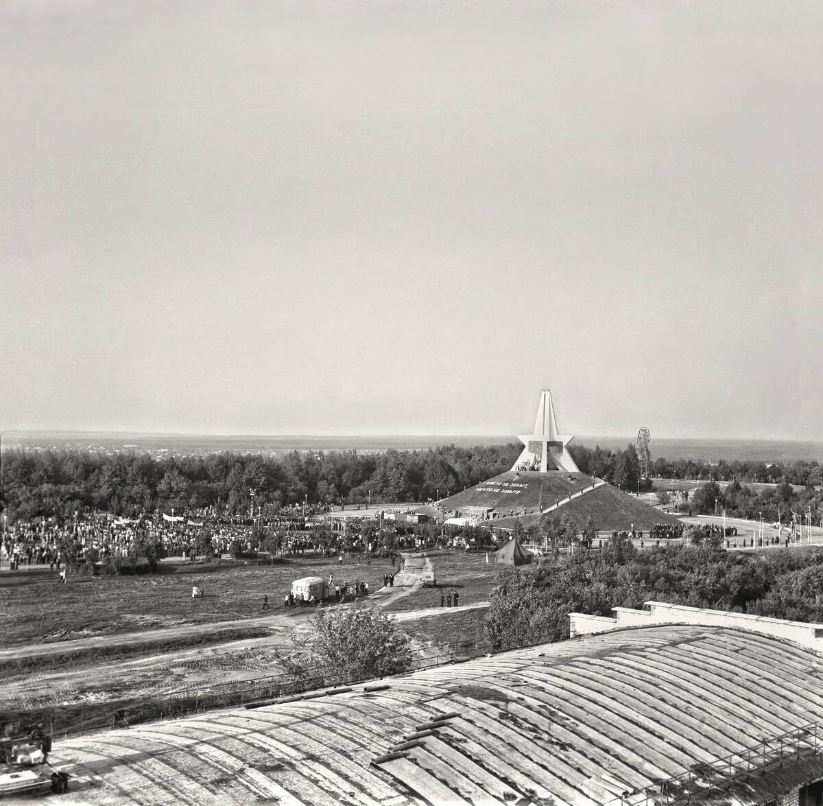На фотографии запечатлён фрагмент торжеств 1976 года на Кургане Бессмертия. В объективе - большое скопление людей, праздничные декорации.
