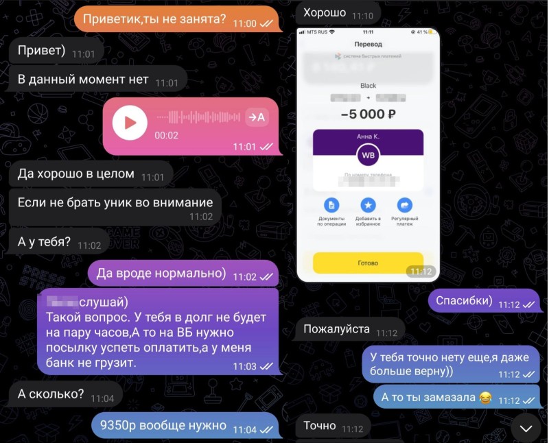Реальный случай: мошенник взломал аккаунт студентки и от её имени попросил в «долг» у подруги. Добавило разводу правдоподобности записанное видео из университета, которое мошенник нашёл в других переписках жертвы.
