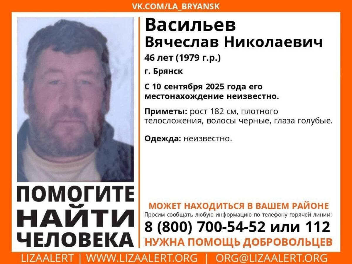 В Брянске без вести пропал 46-летний Вячеслав Васильев. Об этом 25 сентября рассказали в поисково-спасательном отряде «Лиза Алерт».