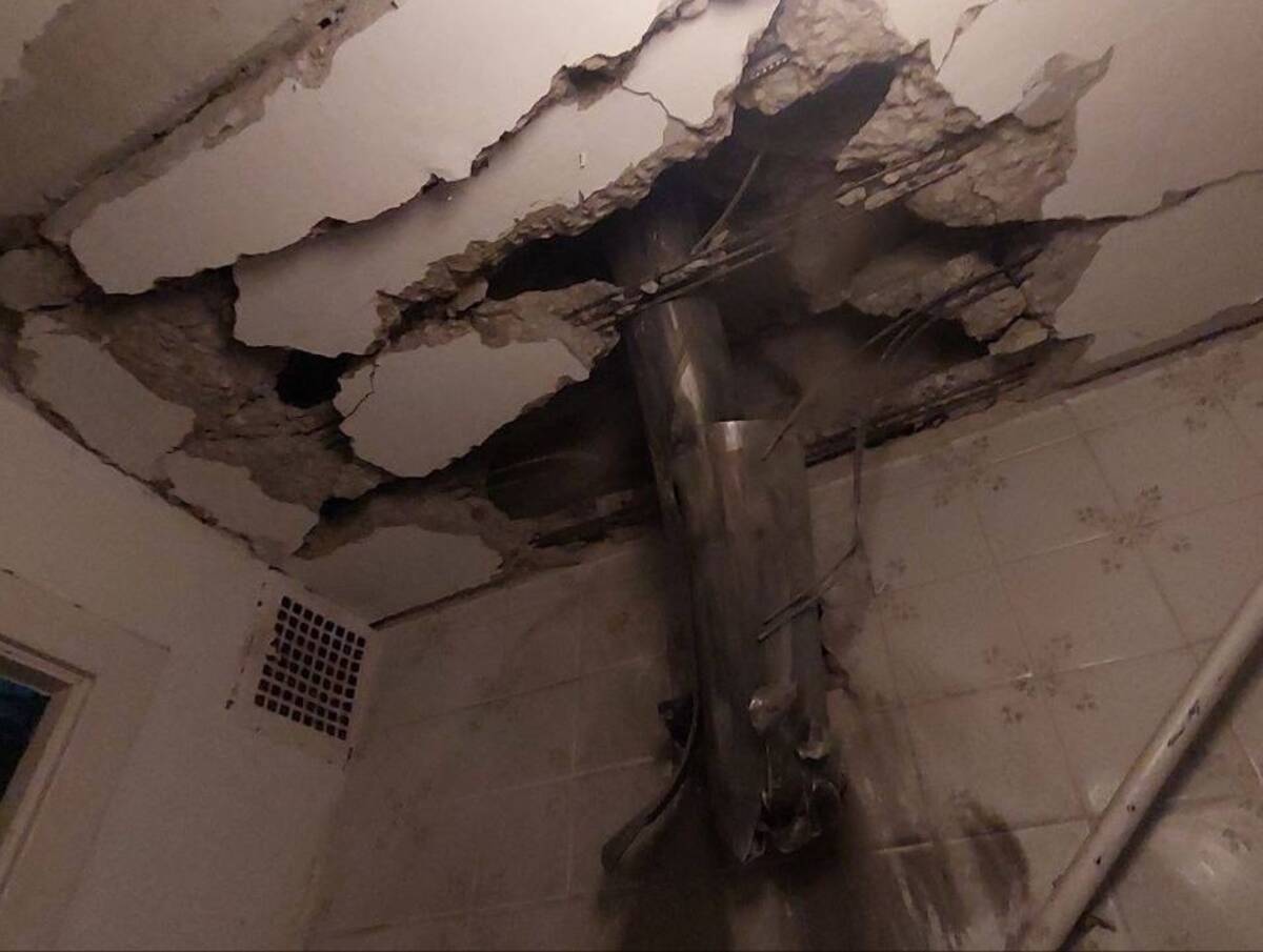На снимках горящие гаражи, выбитые стекла, пробитые стены и потолки. На земле - части ракеты.