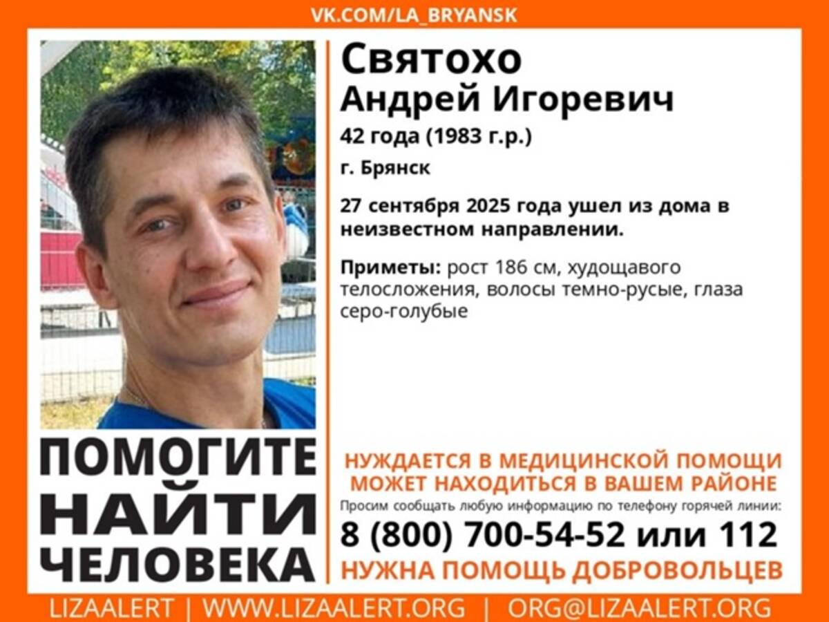 В Брянске разыскивают 42-летнего Андрея Святохо, пропавшего 27 сентября. О местонахождении мужчины до сих пор ничего не известно.