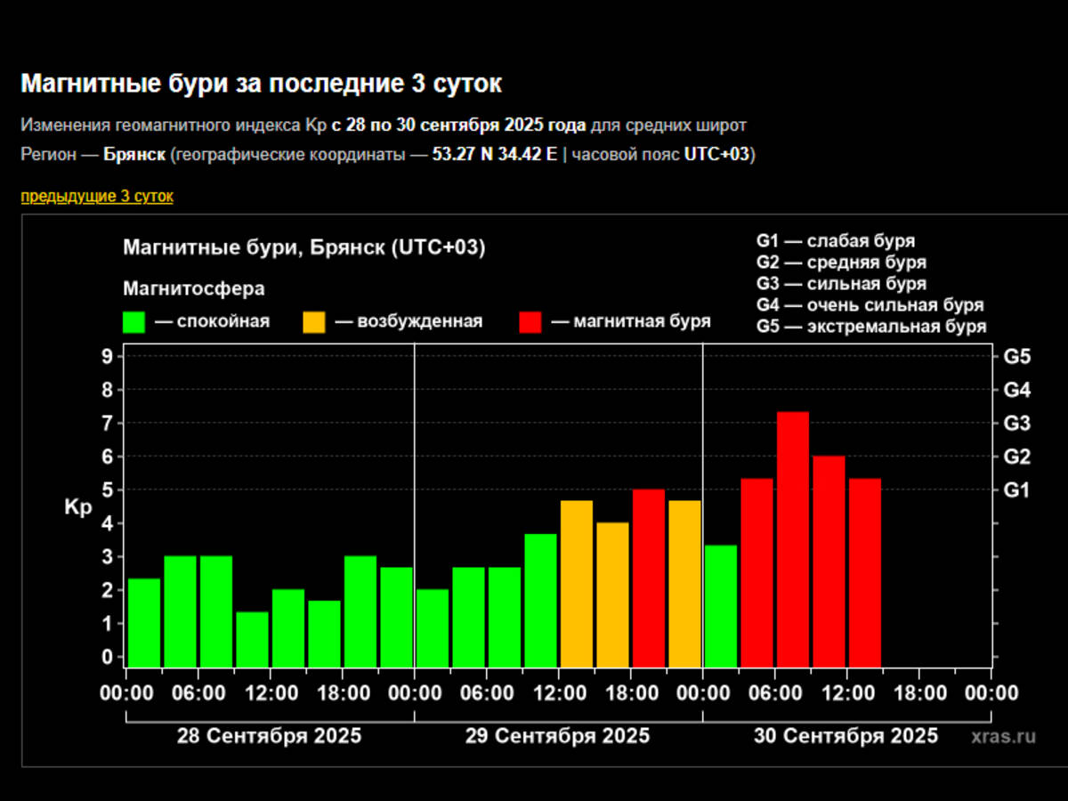 Самая сильная за три месяца магнитная буря угрожает брянцам сегодня, 30 сентября. Её уровень – G3. Подробности сообщили в лаборатории солнечной астрономии Института космических исследований (ИКИ) РАН.