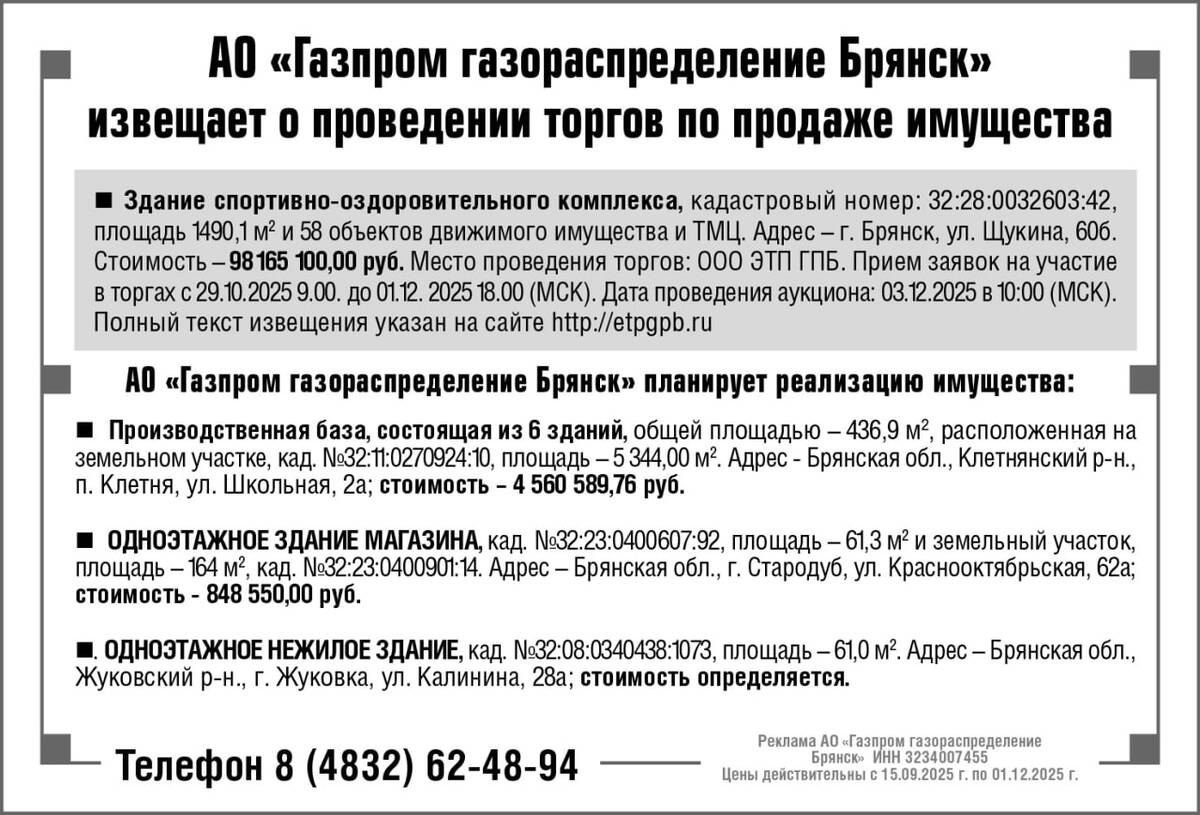 - Здание спортивно-оздоровительного комплекса, кадастровый номер: 32:28:0032603:42, площадь 1490,1 кв.м. и 58 объектов движимого имущества и ТМЦ. Адрес: г. Брянск, ул. Щукина, д.60Б. Стоимость - 98 165 100,00 руб. Место проведения торгов: ООО ЭТП ГПБ. Прием заявок на участие в торгах с 29.10.2025 9.00. до 01.12. 2025 18 (МСК). Дата проведения аукциона: 03.12.2025 10.00. (МСК). Полный текст извещения указан на сайте.