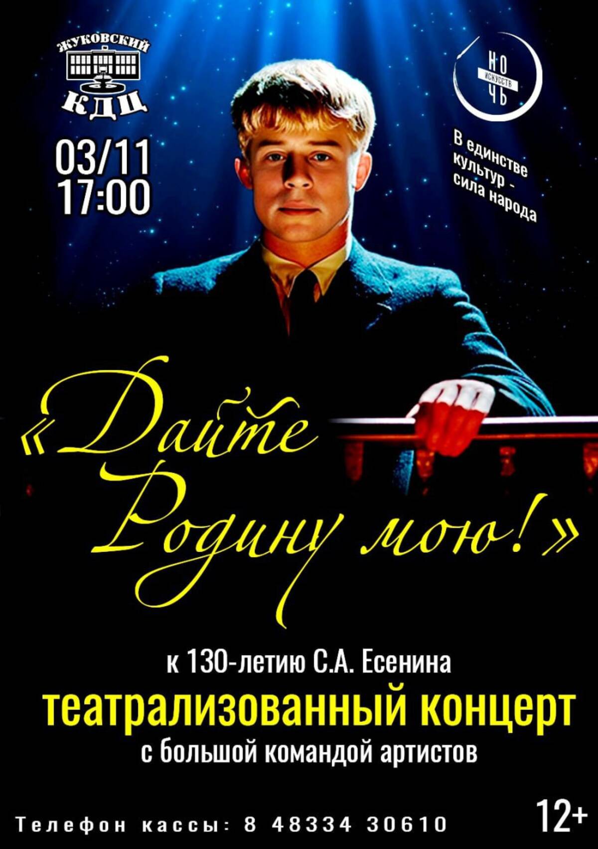 В это время здесь начнётся большое театрализованное представление «Дайте Родину мою". Прозвучат романсы и песни на стихи Сергея Есенина, 130-летний юбилей которого широко отмечается по всей стране. Актёрские коллективы КДЦ обеспечат театральную составляющую вечера.