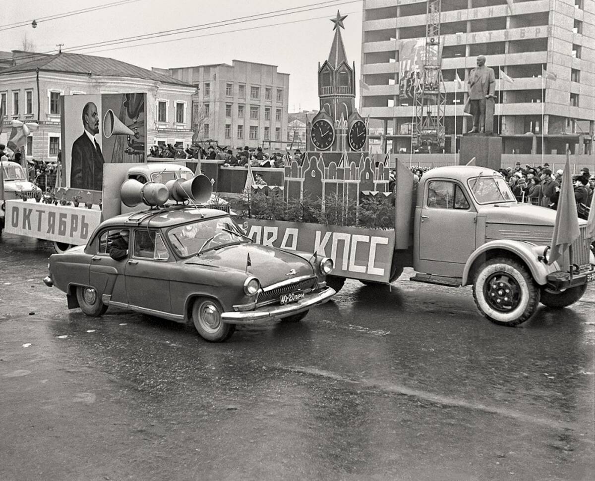 - Сколько всего понамешано в одном кадре: и эпох, и людей, и зданий! Тут и древняя, Спасская башня Московского кремля, и "дом Могилевцевых" начала ХХ века, и конструктивистский Дом Советов, а ещё панельная высотка областной администрации. Кроме того в кадре два Владимира Ильича и три колоколообразных устройства, из разных эпох, для усиления звука. Кажется, что Ленин в одну трубу говорит, а из труб на машине льётся его пламенная речь...