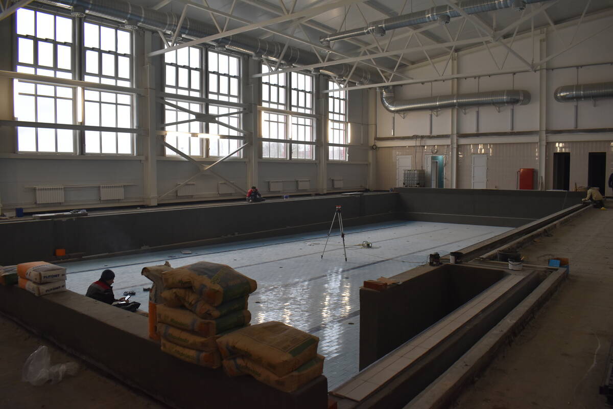 В спортивном зале площадью 1200 кв м на каркас с амортизирующим слоем уложена фанера. Ее закроет спецпаркет, на который будет нанесена разметка для таких командных игр как волейбол, баскетбол и минифутбол. В зоне бассейна отделочники завершают укладку плиткой стен бассейна.