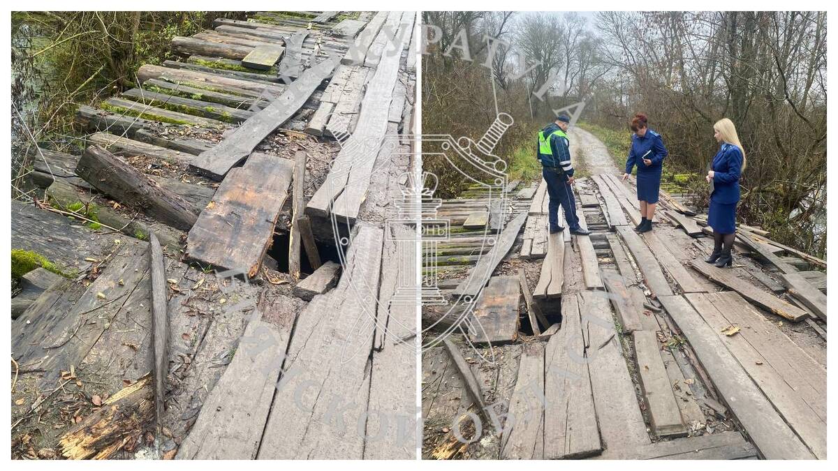 На аварийное состояние дорожного сооружения указали жители деревни Мадеевка. В итоге к мосту через ручей Холопец выехали прокуроры. Информация подтвердилась.