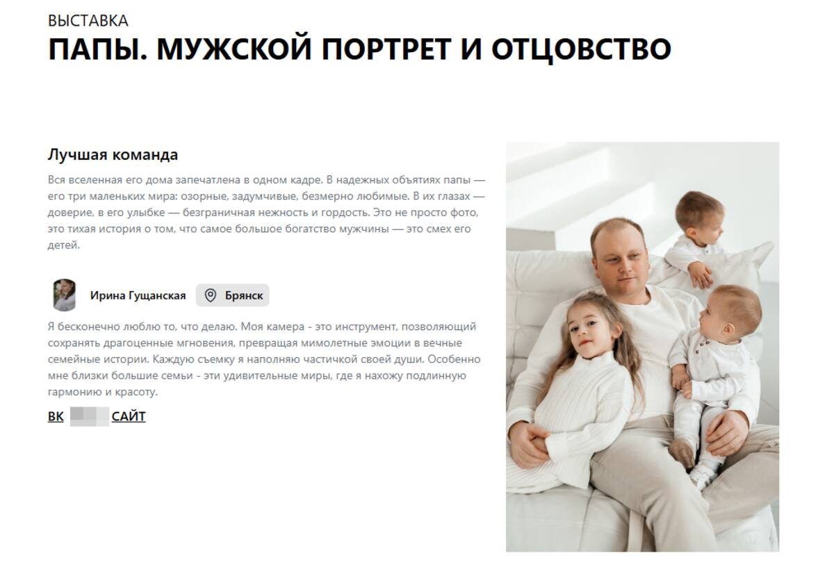 Работы жителя Брянска представлены в фотовыставке «ПАПЫ. Мужской портрет и отцовство». Сама выставка проводится до 15 ноября включительно и посвящена образу мужчины в разные периоды жизни.