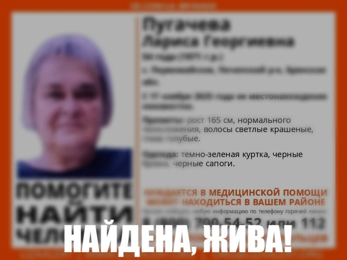 Завершились поиски 54-летней Ларисы Пугачевой из Почепского района. Об этом сообщили в соцсетях волонтёры брянского отряда «Лиза Алерт».