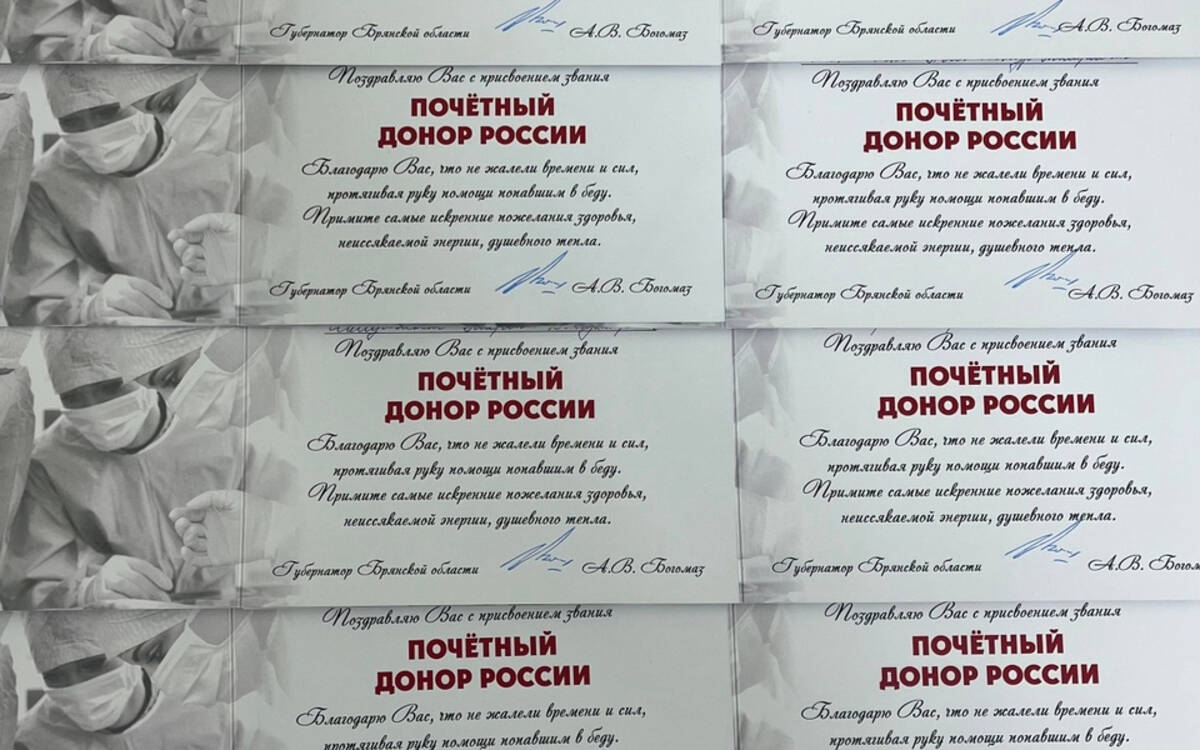 Двенадцать жителей Брянской области были удостоены звания «Почётный донор России». Соответствующий приказ и удостоверения поступили на региональную станцию переливания крови из министерства здравоохранения РФ. Об этом рассказали в сообществе БОСПК во «Вконтакте».