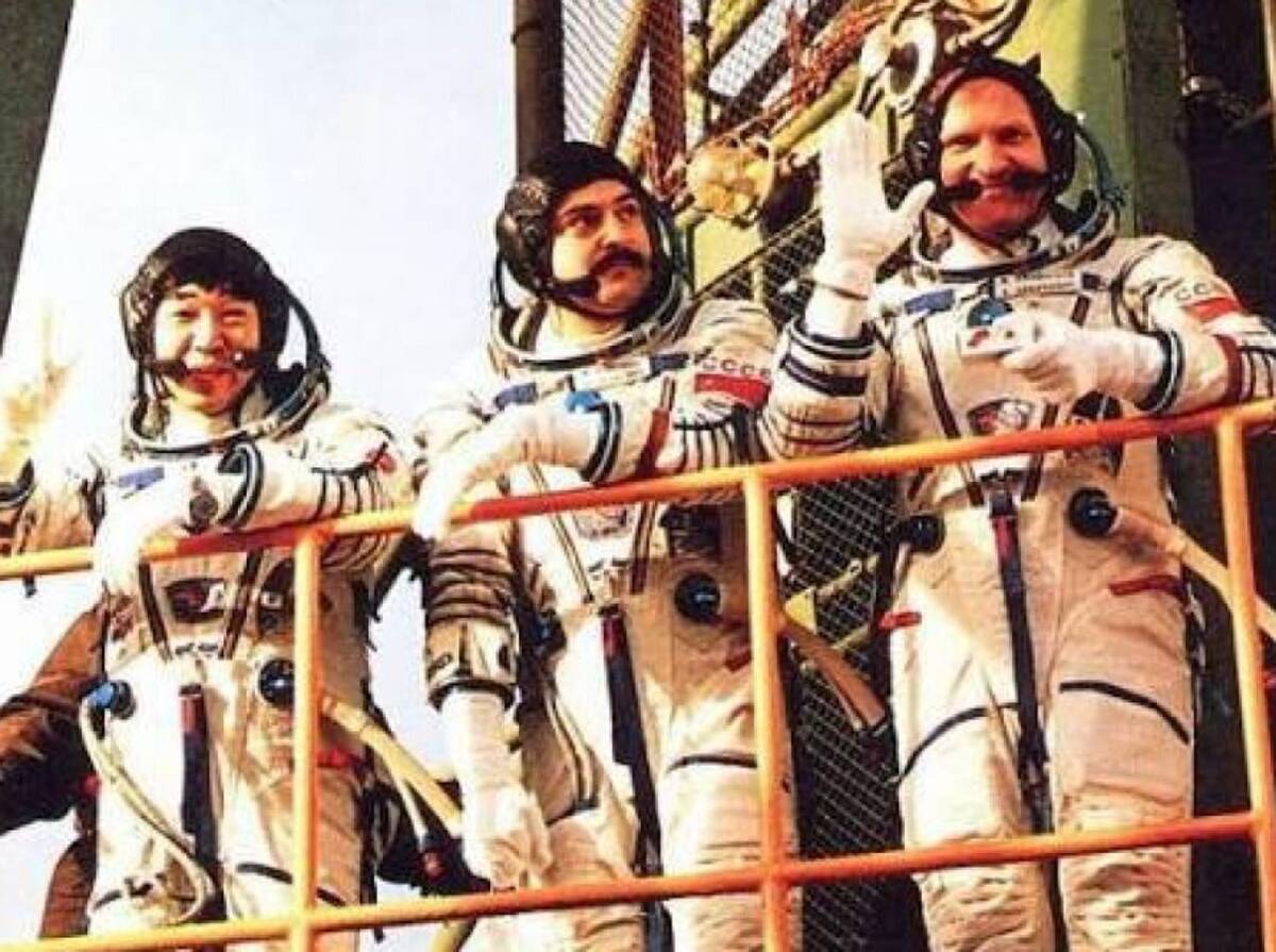 В составе экипажа были лётчик-космонавт Муса Манаров и японский тележурналист Тоёхиро Акияма.