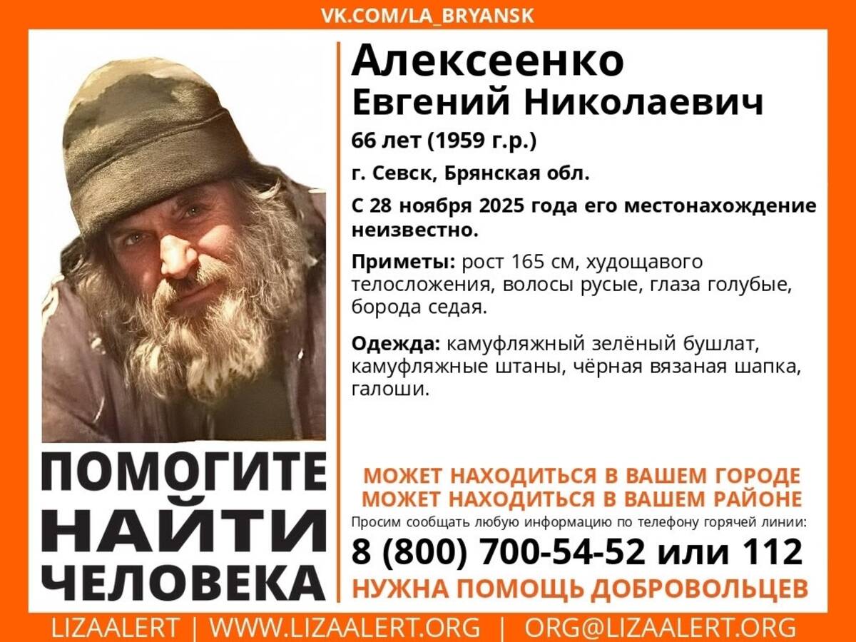 В Севске Брянской области без вести пропал 66-летний Евгений Алексеенко. С 28 ноября его местонахождение неизвестно.