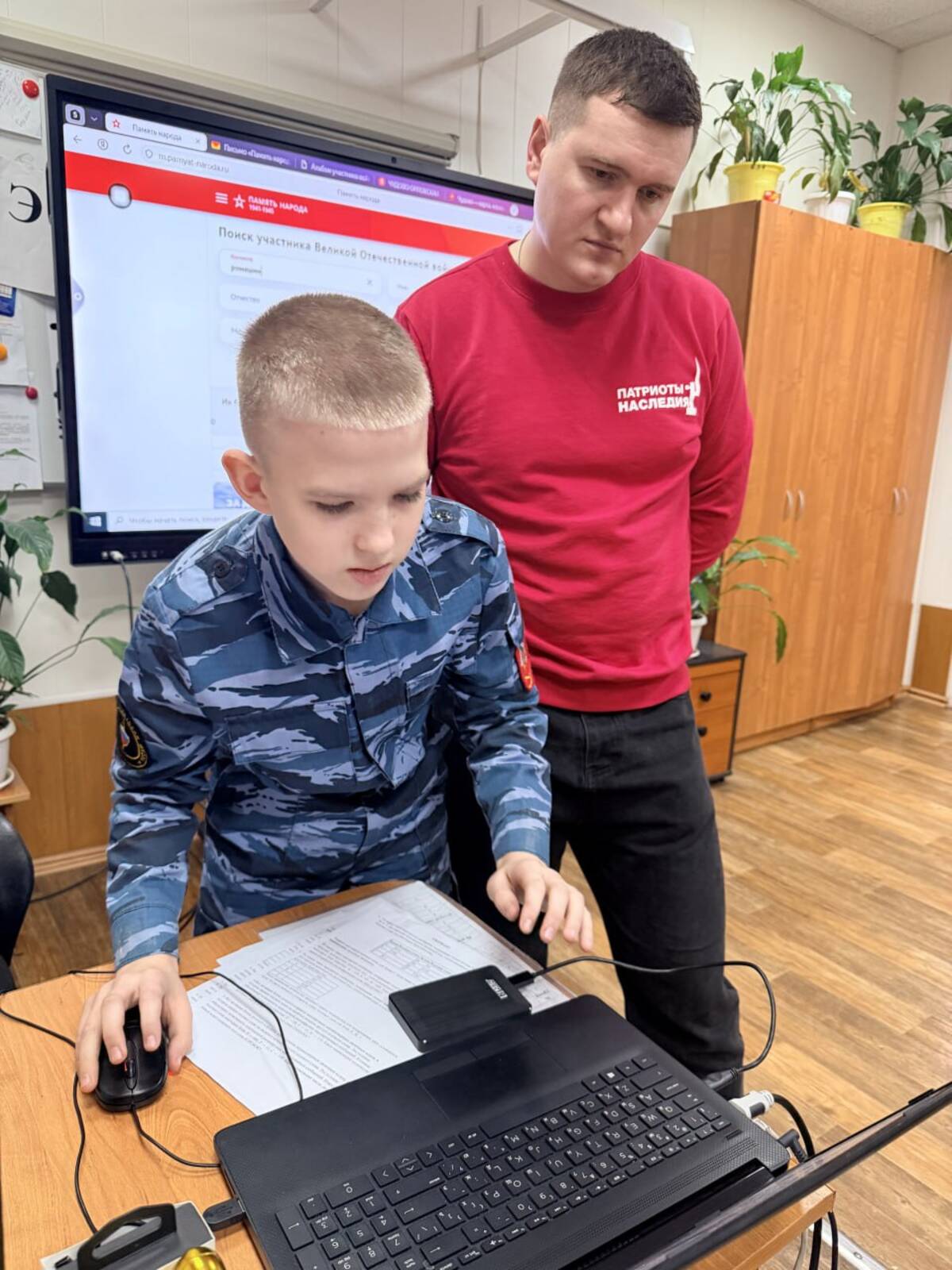Перед кадетами выступил руководитель волонтёрской организации «Патриоты Наследия» Сергей Морозов. Он рассказал о работе с электронными ресурсами, в частности о портале «Память народа», и помог ребятам самостоятельно найти информацию о своих прадедах — участниках Великой Отечественной войны. В ходе занятия кадеты активно задавали вопросы и изучали историю своей семьи.