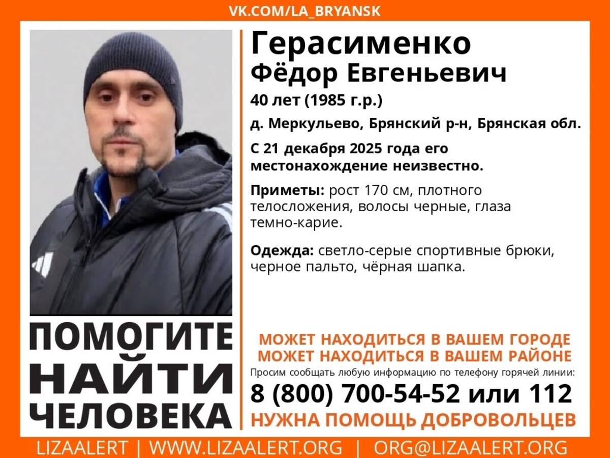 В деревне Меркульево Брянского района без вести пропал 40-летний Фёдор Герасименко. С 21 декабря о его местонахождении ничего не известно.