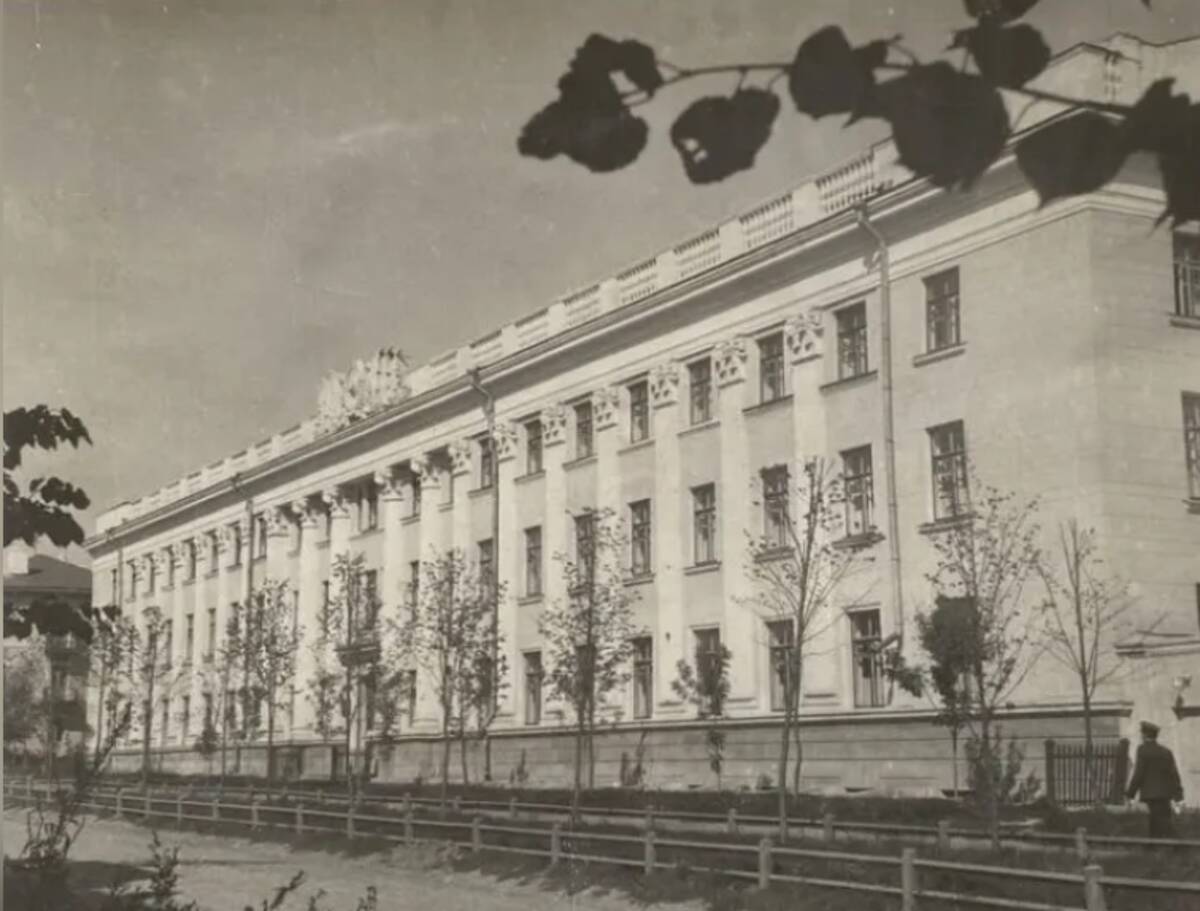 На снимке запечатлено монументальное здание в стиле советского неоклассицизма, спроектированное архитектором Г. И. Спиридоновым. Его светлый фасад украшают колонны, карнизы, рельефы и орнаменты, характерные для торжественной послевоенной архитектуры. Перед зданием видна аллея с молодыми деревьями и деревянный забор, а фигура прохожего на переднем плане помогает оценить масштаб постройки.