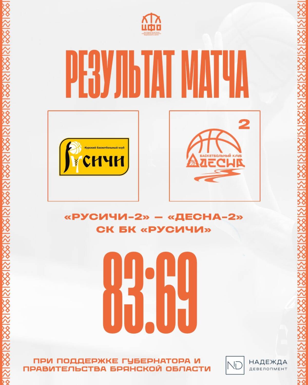Баскетбольный клуб «Десна-2», представляющий Брянскую область, потерпел поражение в первом матче против команды «Русичи-2». Встреча завершилась со счетом 83:69 в пользу хозяев площадки.