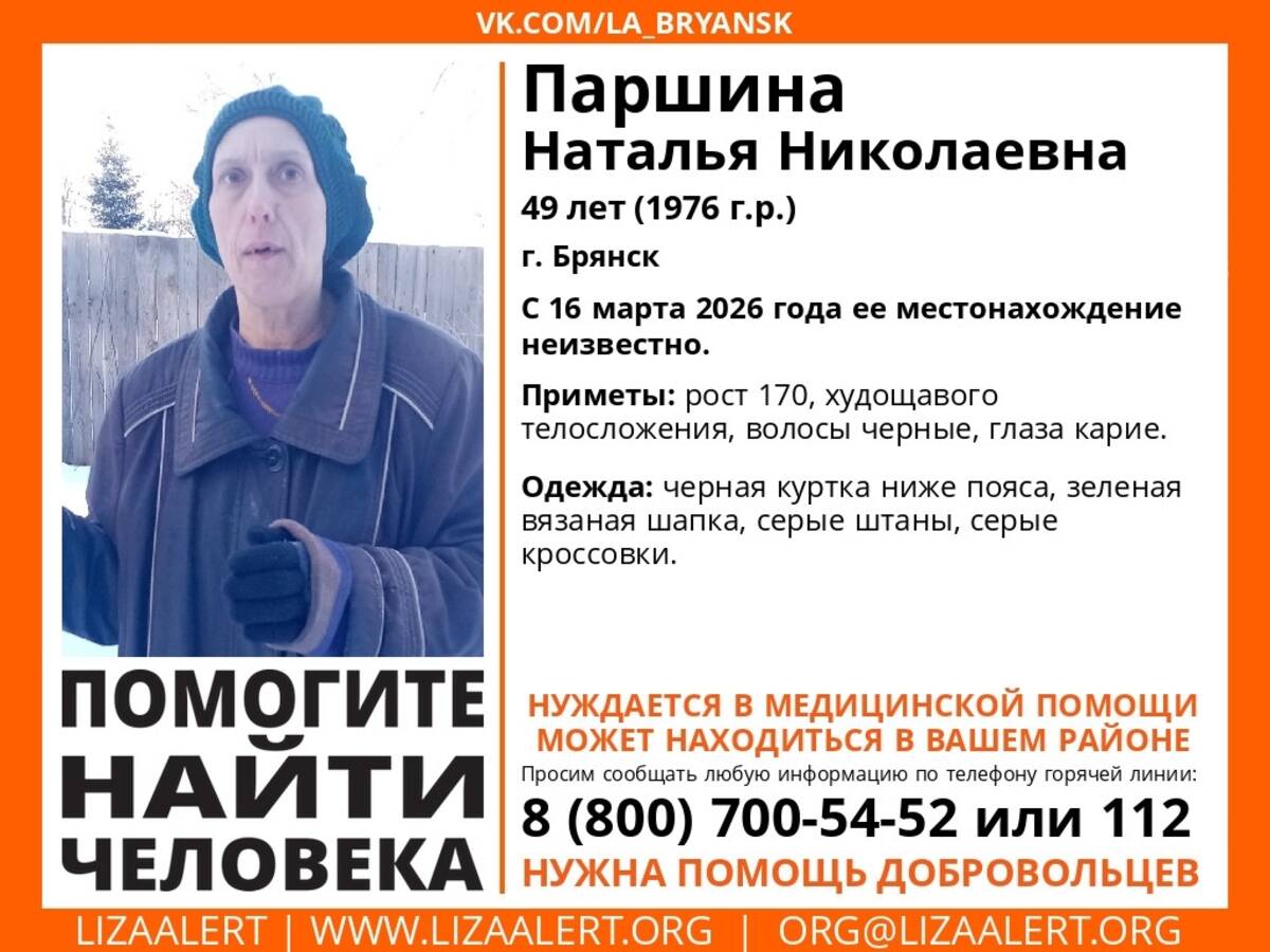В Брянске без вести пропала 49-летняя Наталья Паршина. 16 марта она ушла из дома и не вернулась. Женщина нуждается в медпомощи.