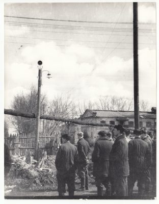 В центре второй фотографии - крутая деревянная лестница. По воспоминаниям старожилов, она вела в кафе-закусочную. На ступенях (и не только) сидят рабочие. Их лица сосредоточены и взволнованны…