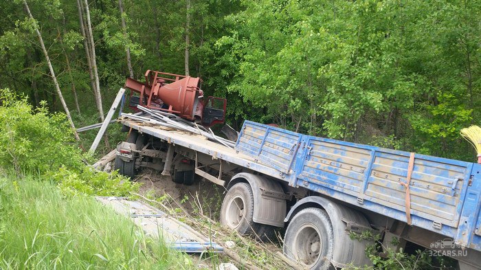 Фото с места ЧП появились на 32Cars.ru. Сообщается, что водитель серьезно не пострадал, а грузовик снес опору освещения и порвал провода.